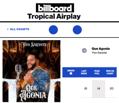 Nueva York, SL .– Yiyo Sarante, la voz principal del movimiento salsero de República Dominicana disfruta de una privilegiada posición internacional con su sencillo “Qué Agonía”. La canción se encuentra en el puesto número 18 en la lista de Airplay Tropical de Billboard esta semana.
